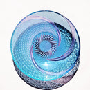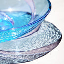 大きく広がる曲線と中央の斜めの線が、静止しているのにまるでお皿が回転しているかのような印象を与えます。グリーン とネオジウムの爽やかな色合いのガラスへ、大胆に菊つなぎを施したお皿です。流れるように入れ込まれた細かな菊つなぎは、見る者を圧倒する美しさがあります。